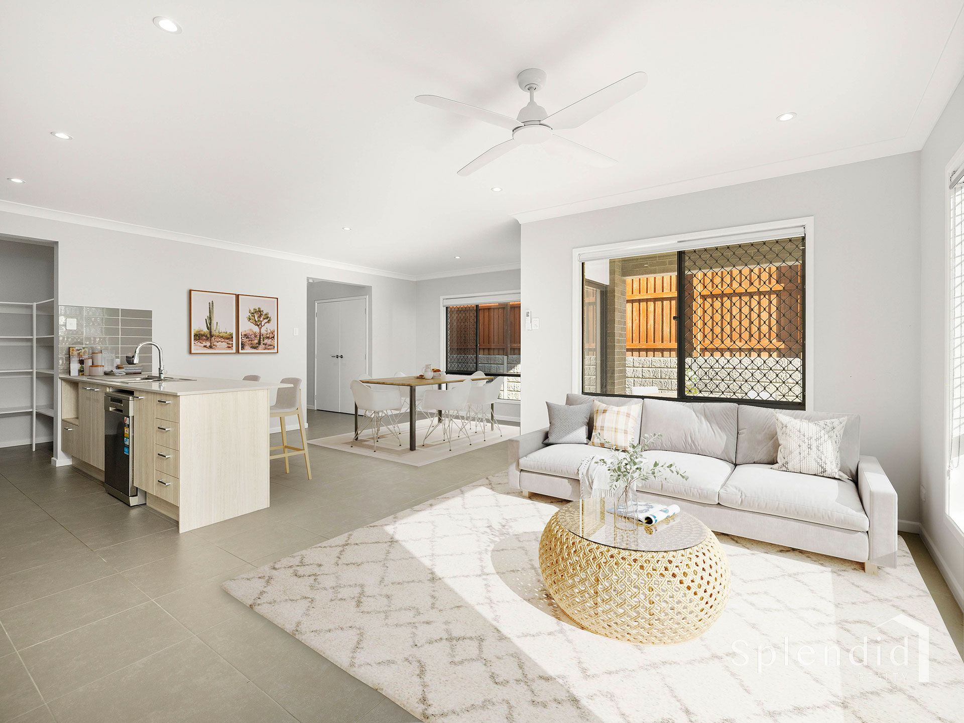 Thoughtfully designed, the home features an open-plan layout that flows seamlessly from the living and dining area to a well-appointed contemporary kitchen with ample storage and a generous pantry.
